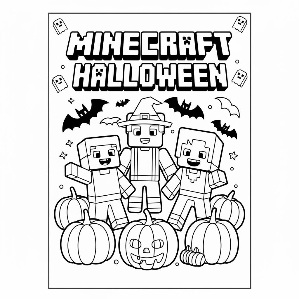 Página de colorir temática de Halloween com personagens de minecraft e abóboras.