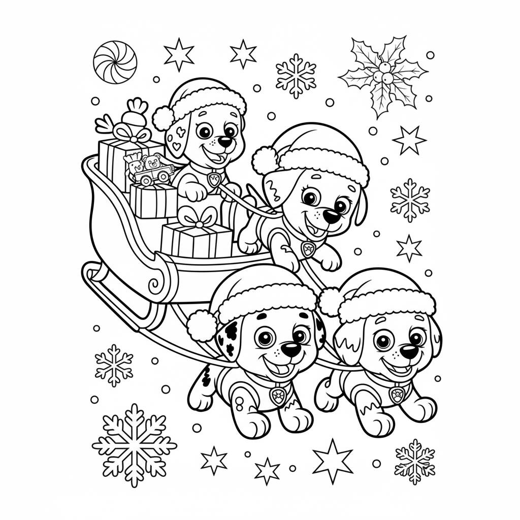 Una divertida página para colorear navideña con adorables cachorros en un trineo.