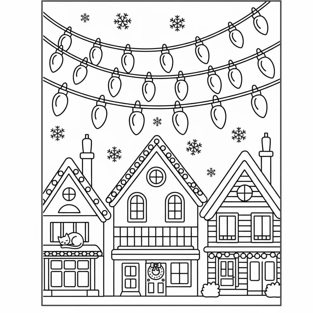 Página de colorir temática de Navidad com casas enfeitadas e luzes natalinas.