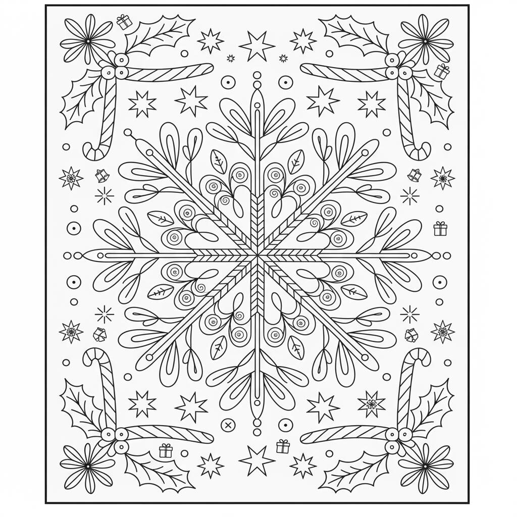Página para colorir temática de Navidad com flocos de neve e doces, ideal para crianças e amantes do Navidad.