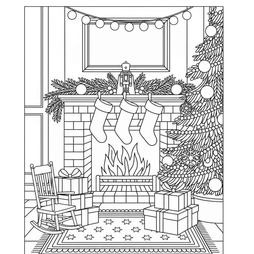 Un precioso dibujo para colorear con una chimenea decorada y un árbol de Navidad, perfecto para celebrar las fiestas.