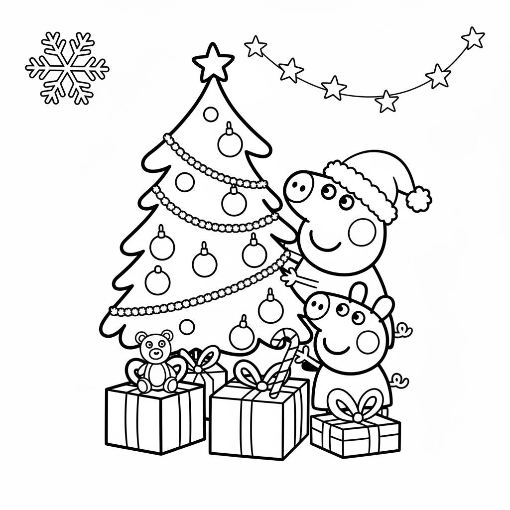 Un divertido dibujo navideño para colorear con cerditos decorando el árbol y los regalos.