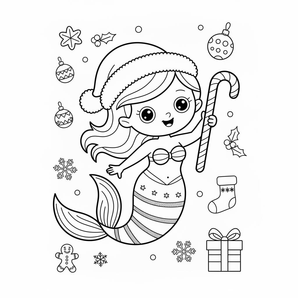 Divertido dibujo para colorear de una sirena festiva con elementos navideños, ideal para estimular la creatividad de los niños.
