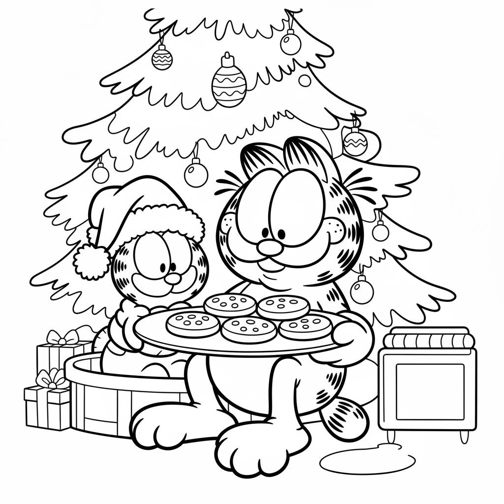 Página de colorir do Garfield e seu amigo em clima natalino, perfeita para as festividades.