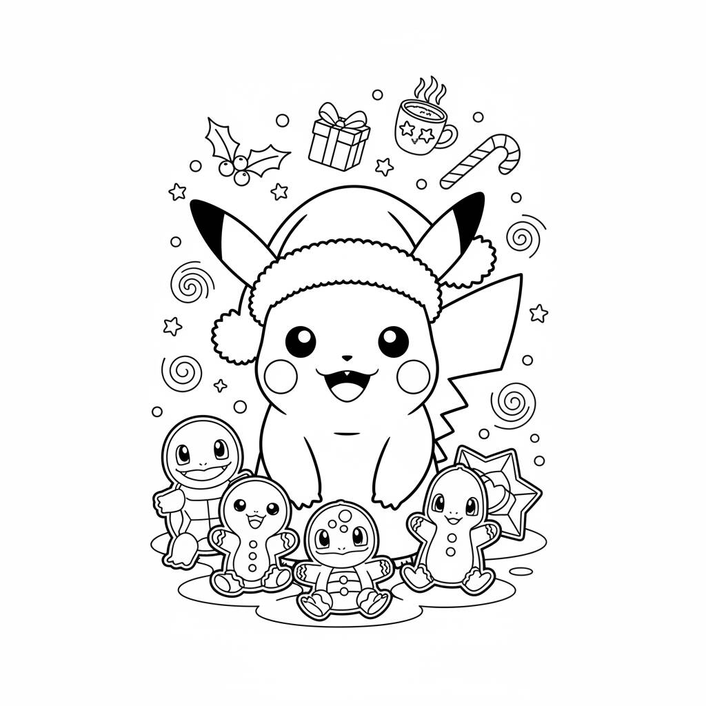 Colorido diseño navideño con Pikachu y sus amigos, perfecto para la diversión de los niños.