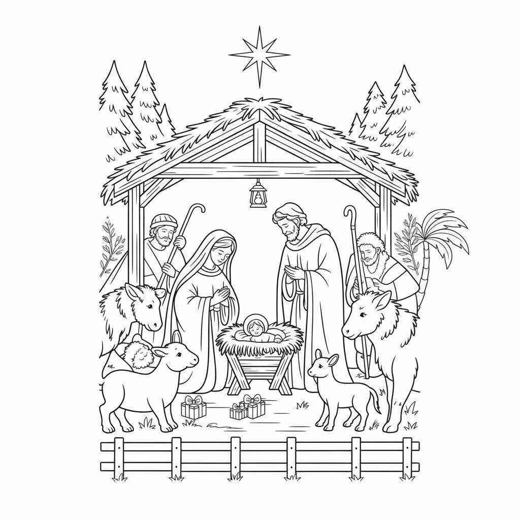 Un precioso dibujo para colorear con el belén, perfecto para celebrar la Navidad.