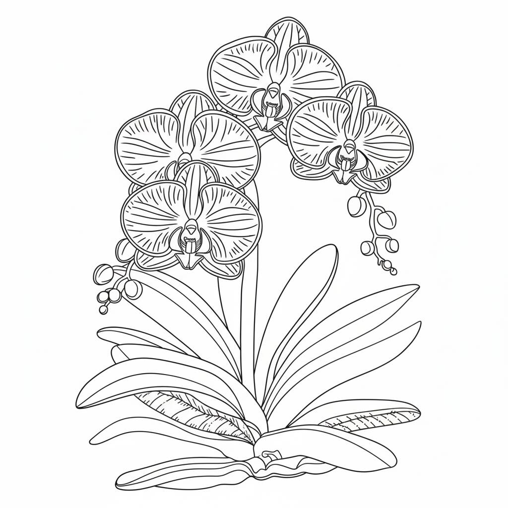 Una hermosa página para colorear con orquídeas detalladas, perfecta para la relajación y la creatividad.