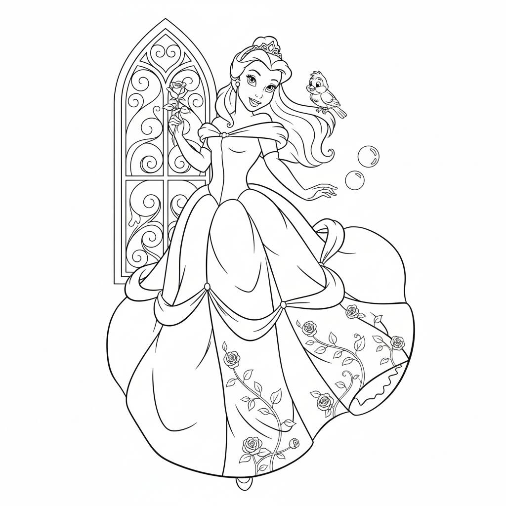 Colorear este dibujo de una princesa rodeada de flores y un pájaro es una actividad divertida y creativa para los niños.