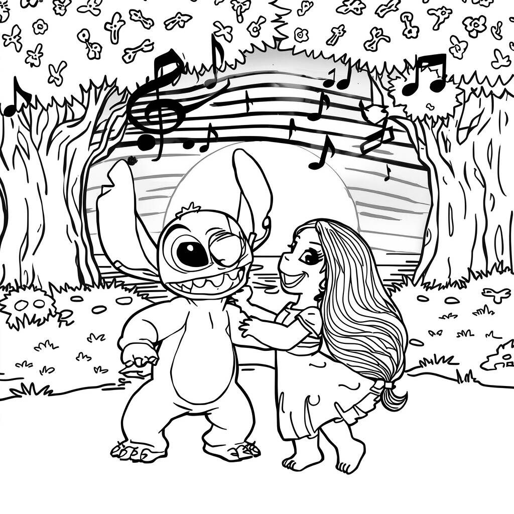 Mientras bailan, no sólo celebran la música, sino también la conexión inquebrantable que han formado. La energía vibrante entre ellos es contagiosa y cada movimiento es una expresión de amor y diversión. Al colorear esta escena, puedes darle vida a la alegría que emana del dúo, usando colores brillantes para capturar la esencia de la amistad que une a Stitch y Lilo, incluso en sus aventuras más salvajes.