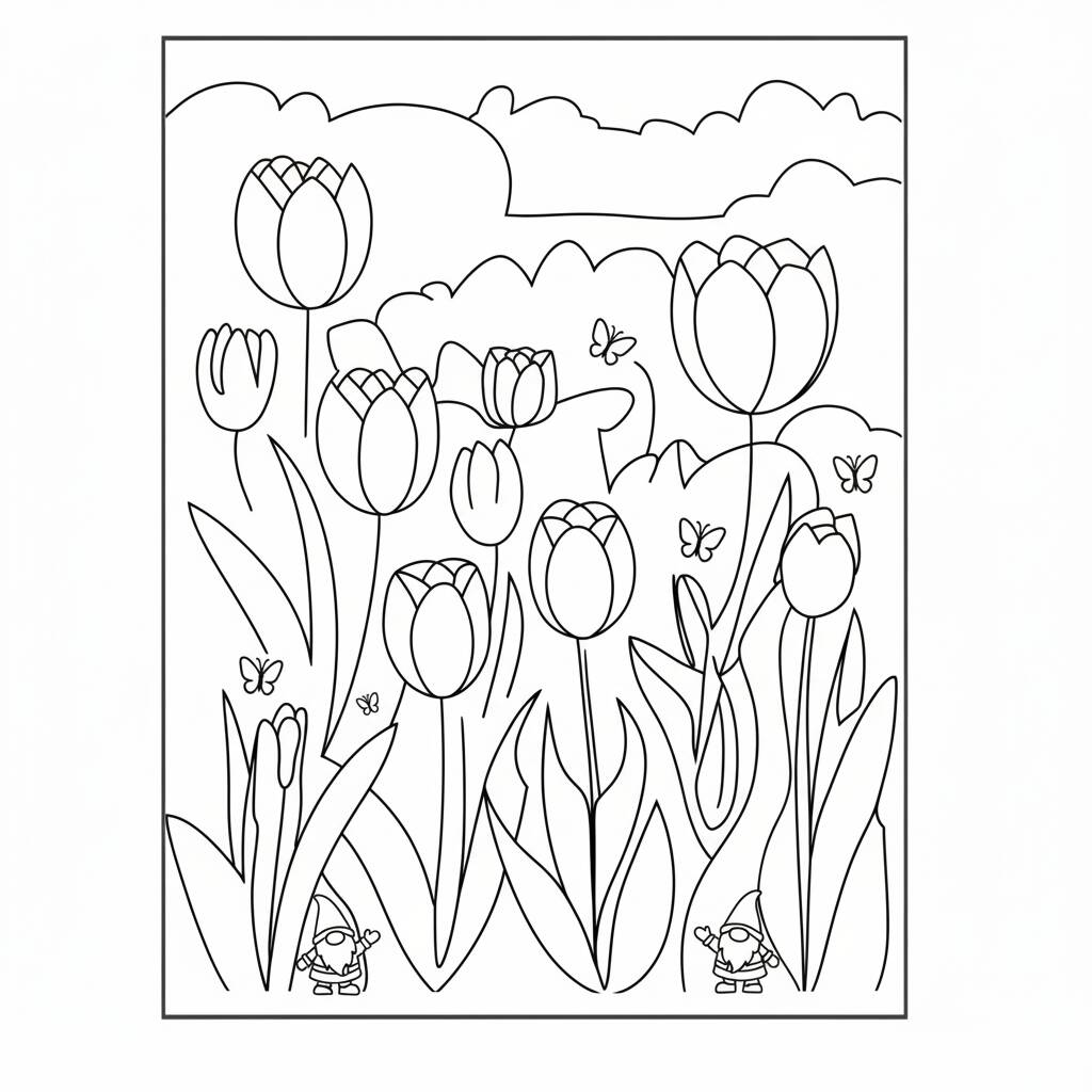 Un divertido dibujo para colorear con tulipanes y gnomos, perfecto para estimular la creatividad de los niños.