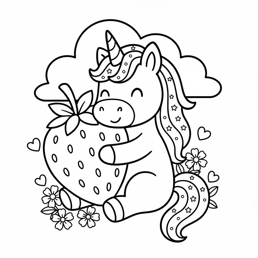 Una divertida página para colorear que presenta un adorable unicornio sosteniendo una fresa, perfecta para niños.