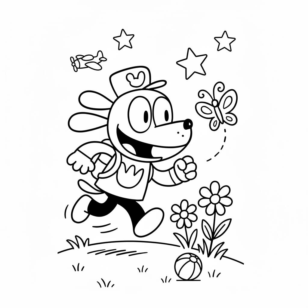 Un divertido dibujo para colorear de Dog Man corriendo en un entorno lleno de flores y estrellas.