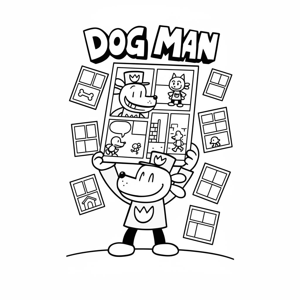 Una divertida página para colorear de Dog Man sosteniendo un cómic, perfecta para los niños que aman la aventura y la creatividad.
