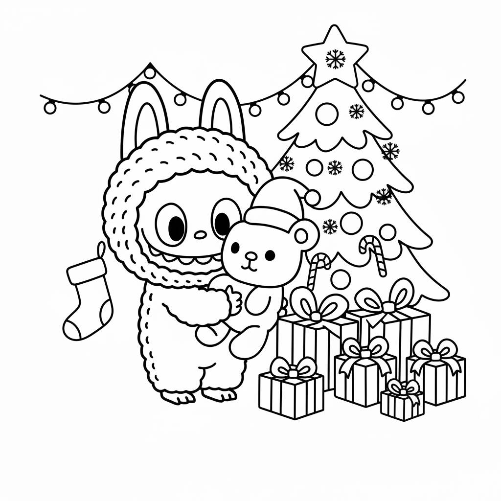 Divertido dibujo de Labubu con su osito de peluche, ideal para que los niños coloreen durante las fiestas.