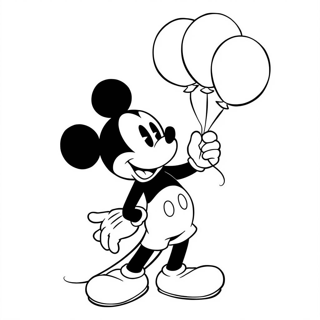 En esta página para colorear de Mickey Mouse, el personaje icónico aparece retratado en una pose juguetona, sosteniendo globos de colores que flotan alegremente a su alrededor. Para darle vida a esta divertida escena, comienza coloreando a Mickey en sus tonos clásicos: un body negro, pantalones rojos y zapatos amarillos. Los globos pueden ser una explosión de colores, desde el azul y el verde hasta el amarillo y el rojo, estimulando la creatividad de quien está coloreando.