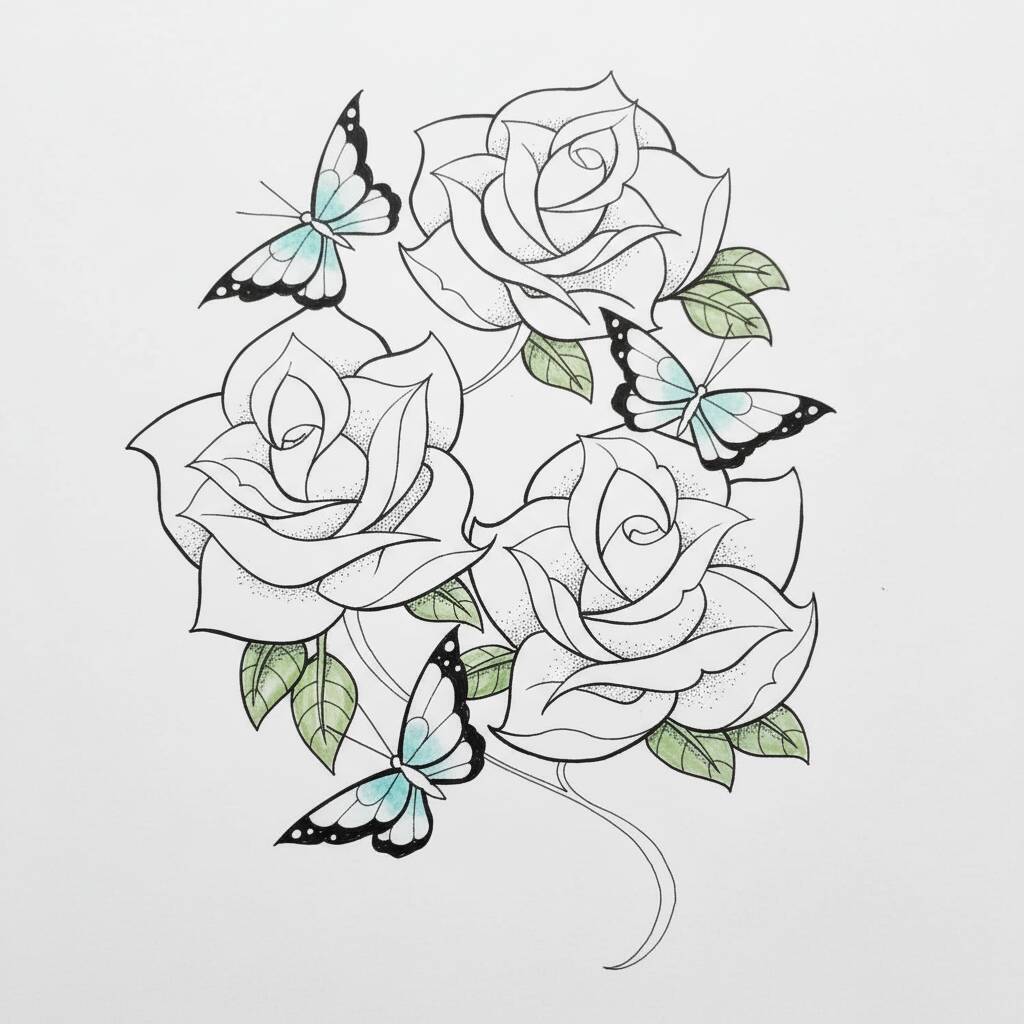 Página de colorir com lindas rosas e borboletas, ideal para relaxar e estimular a criatividade.