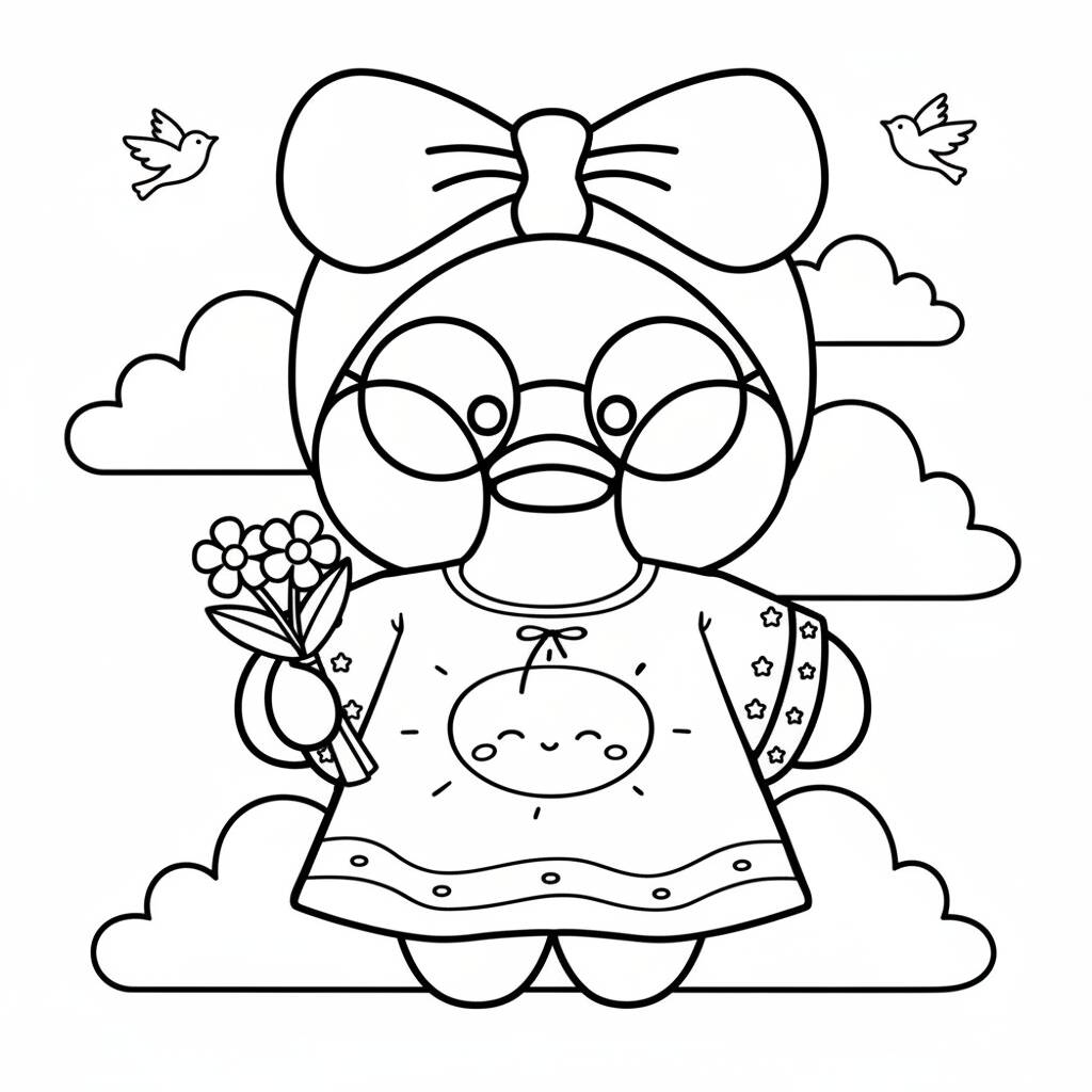 Colorea este adorable dibujo de Paper Duck sosteniendo flores, perfecto para niños y amantes del arte.