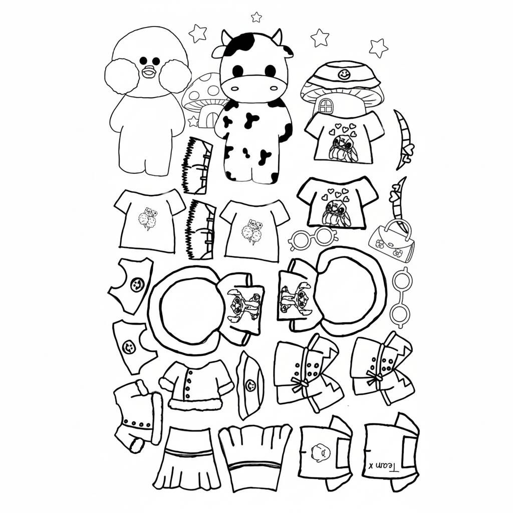 Una divertida página para colorear con el tema Paper Duck llena de ropa para colorear e imprimir.