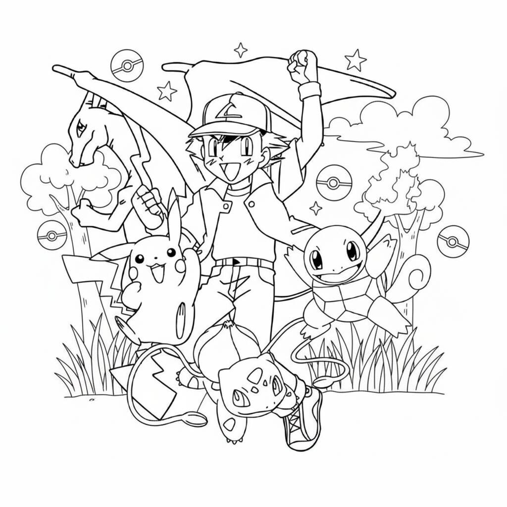 Una divertida página para colorear con Ash y su Pokémon favorito, perfecta para fanáticos de todas las edades.