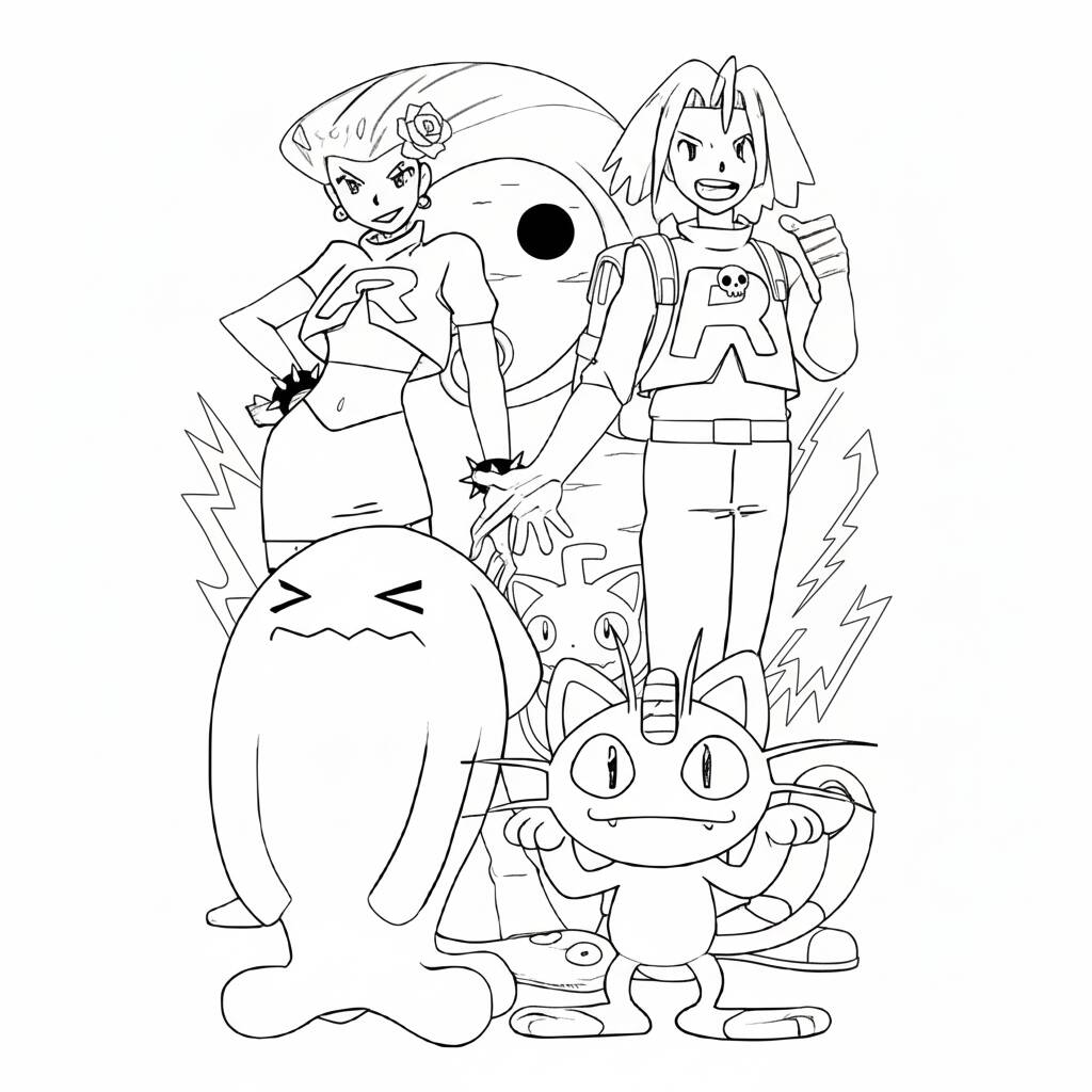 Una divertida página para colorear del Equipo Rocket perfecta para los fanáticos de Pokémon.