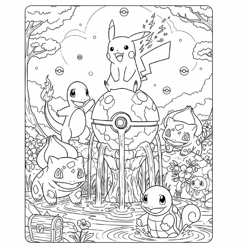 Una divertida página para colorear con Pikachu y sus amigos Pokémon en un entorno encantador.