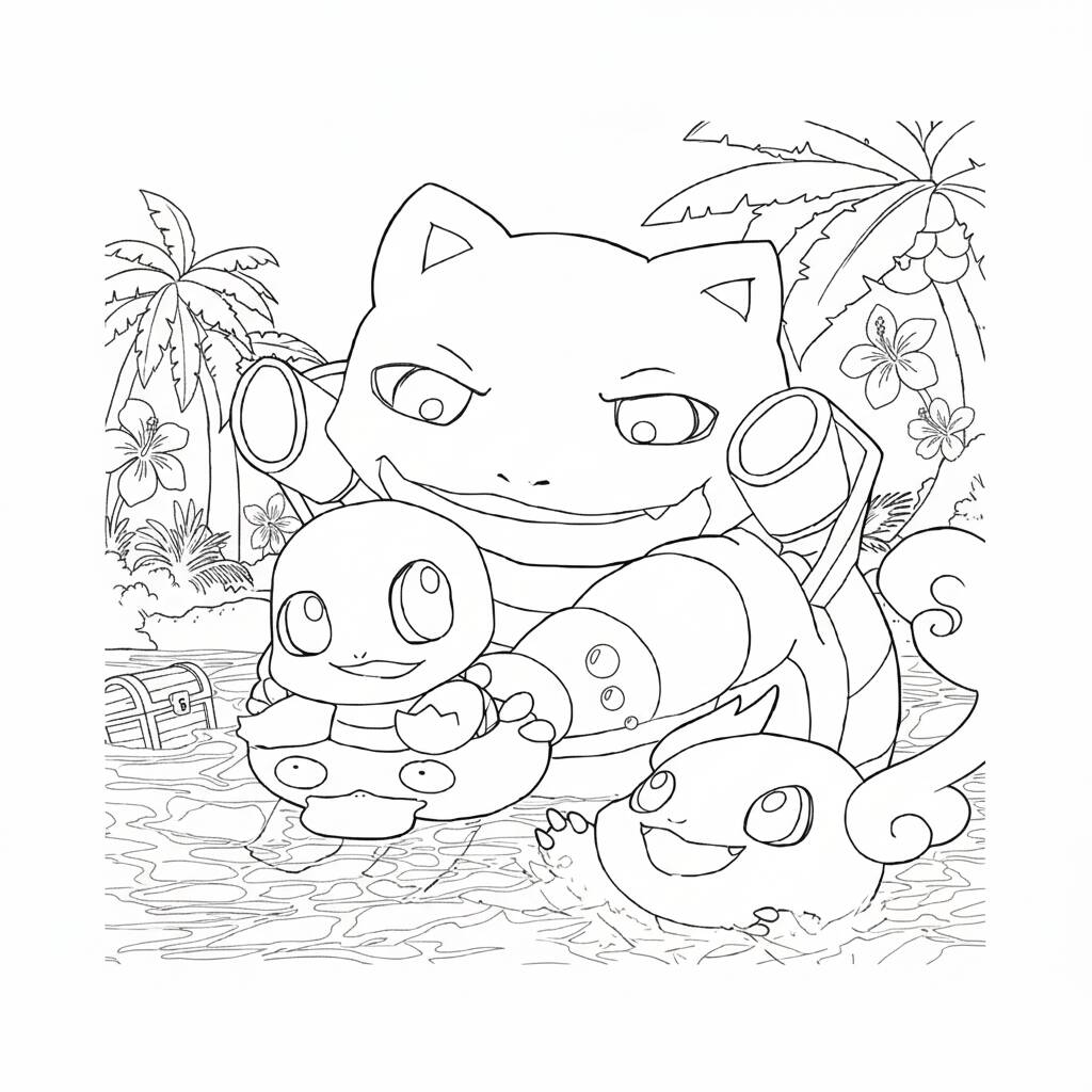 Una divertida página para colorear con Pokémon Squirtle y Blastoise en un entorno tropical.