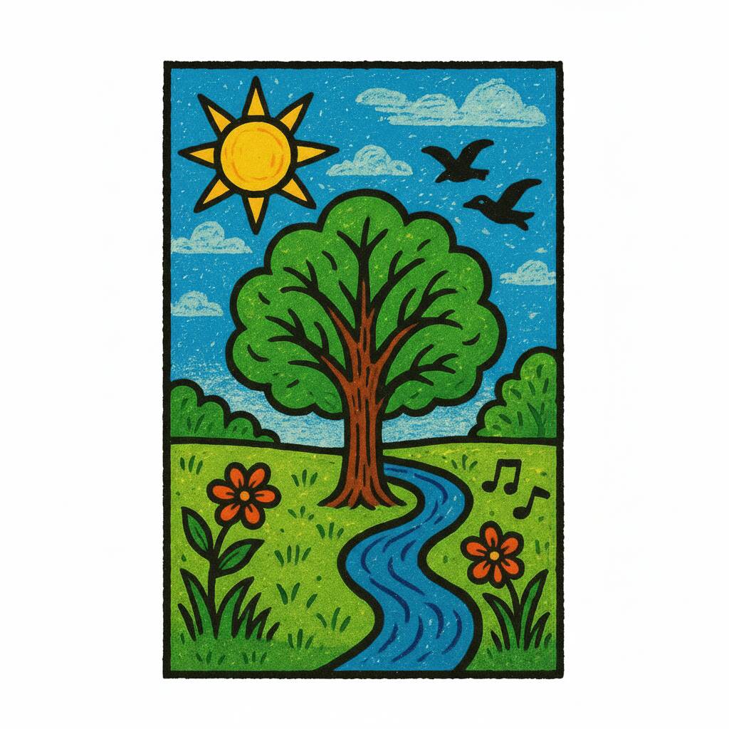 Coloreando un paisaje vibrante con un hermoso cielo, un árbol verde y un río serpenteante.