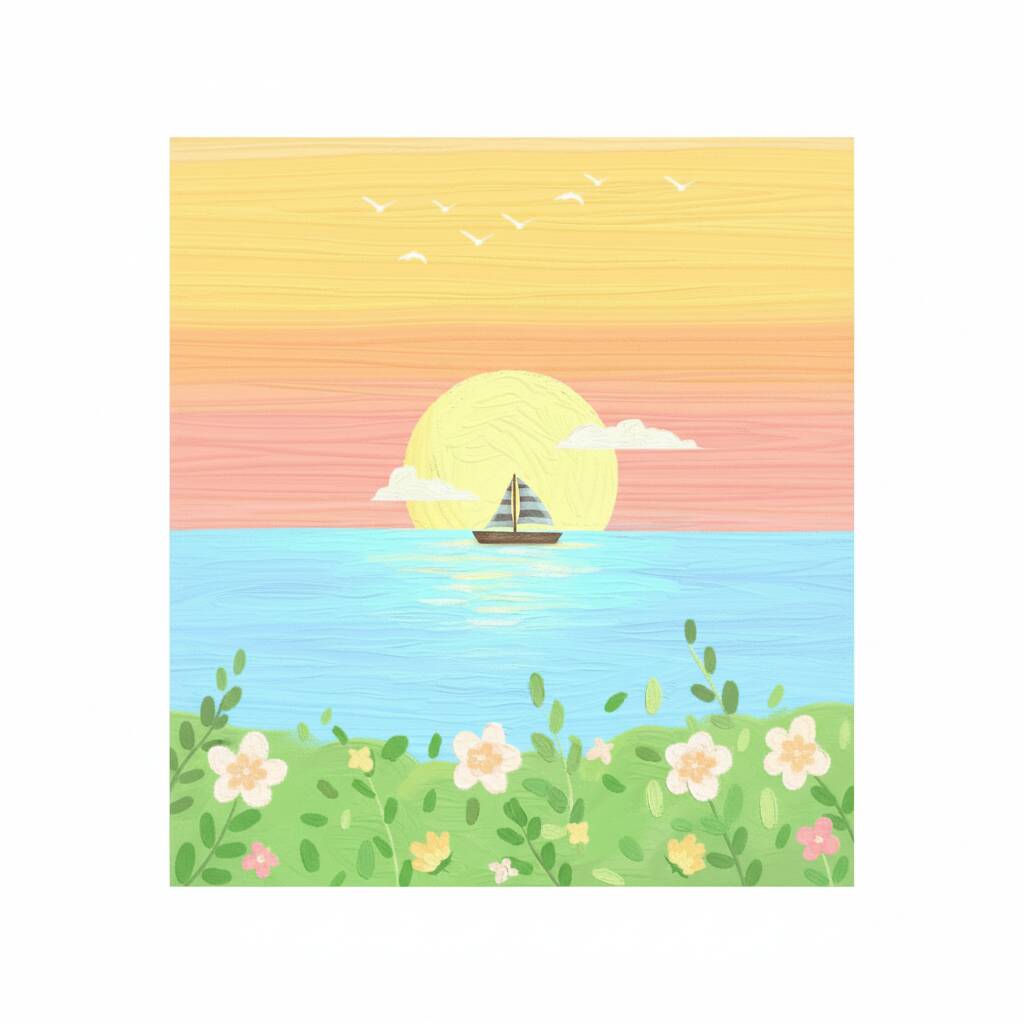 Paisaje para Dibujar: dibujo de atardecer con barco y flores.