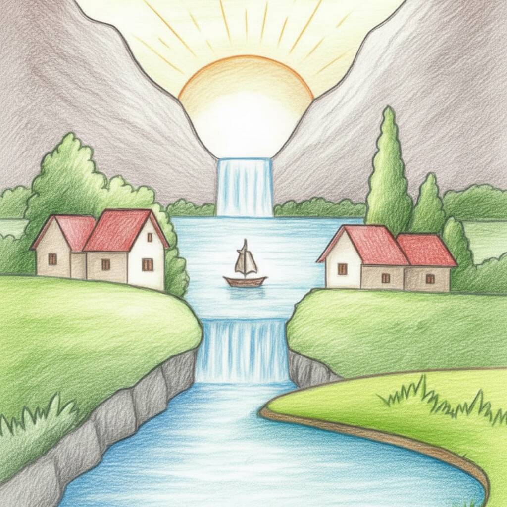 Paisaje para dibujar: dibujo sereno de casas junto al río con montañas y sol naciente
