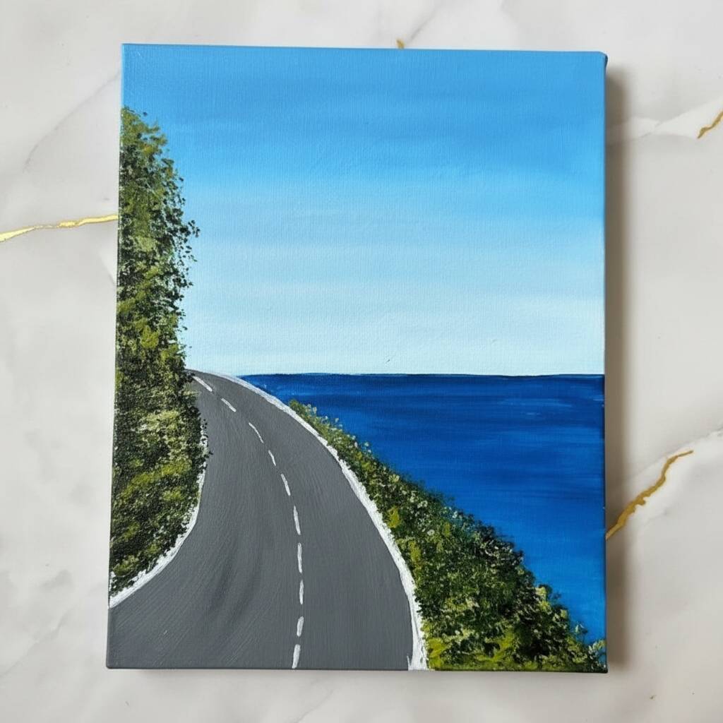Uma bela página de coloração de uma estrada que se conecta ao mar, ideal para relaxar e soltar a criatividade.