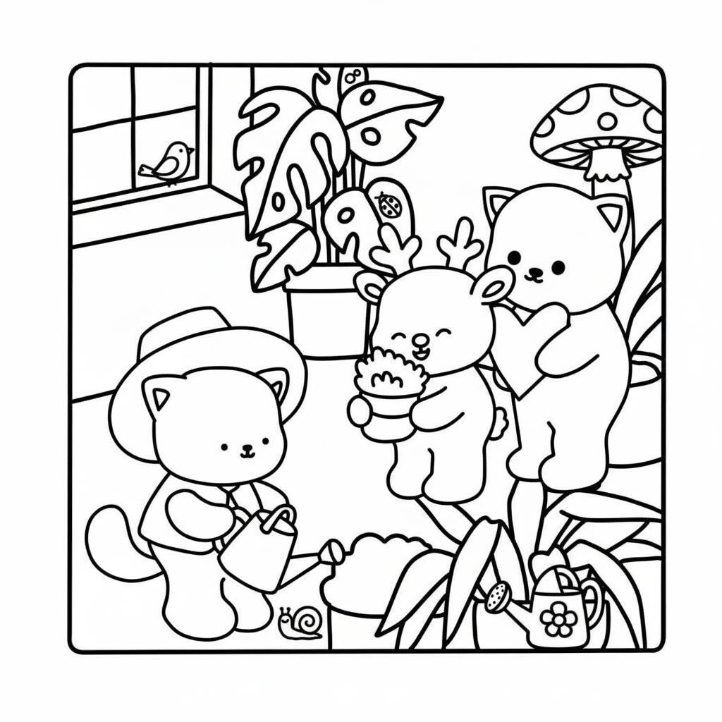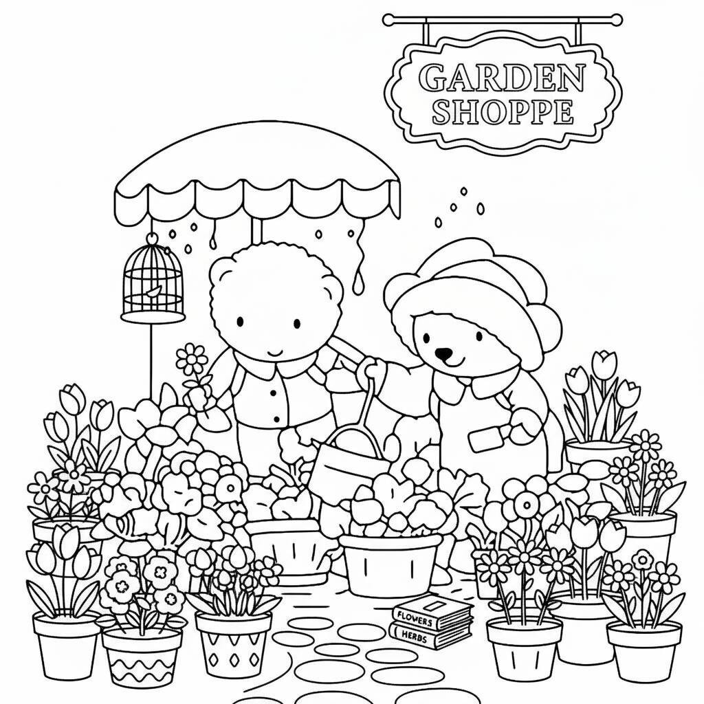 Uma divertida página para colorir com os amigos aconchegantes em uma loja de jardinagem, perfeita para estimular a criatividade.