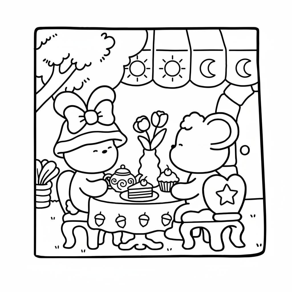 Uma divertida página para colorir com os Cozy Friends desfrutando de um chá em um ambiente acolhedor.