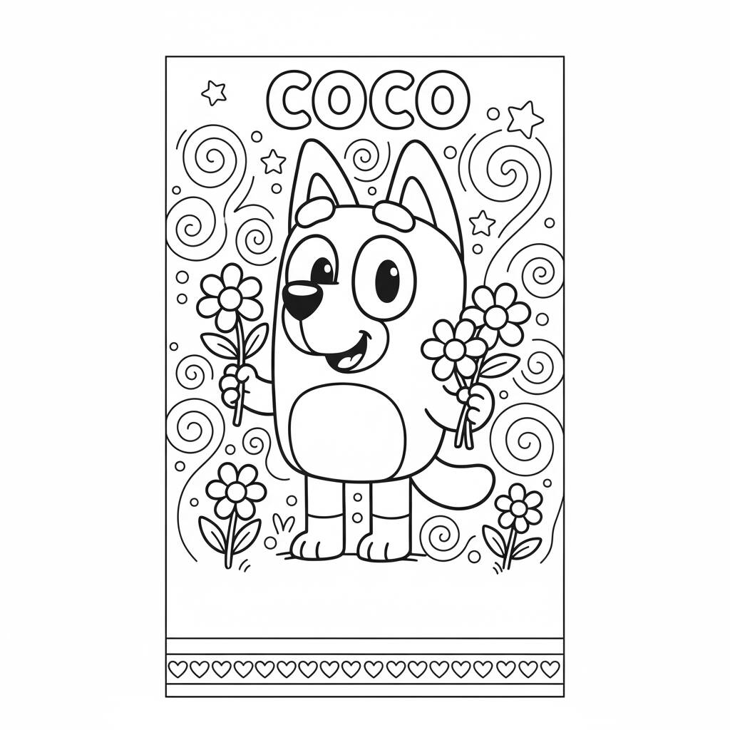Uma divertida página de colorir da Coco do Bluey, perfeita para crianças que adoram arte e criatividade.