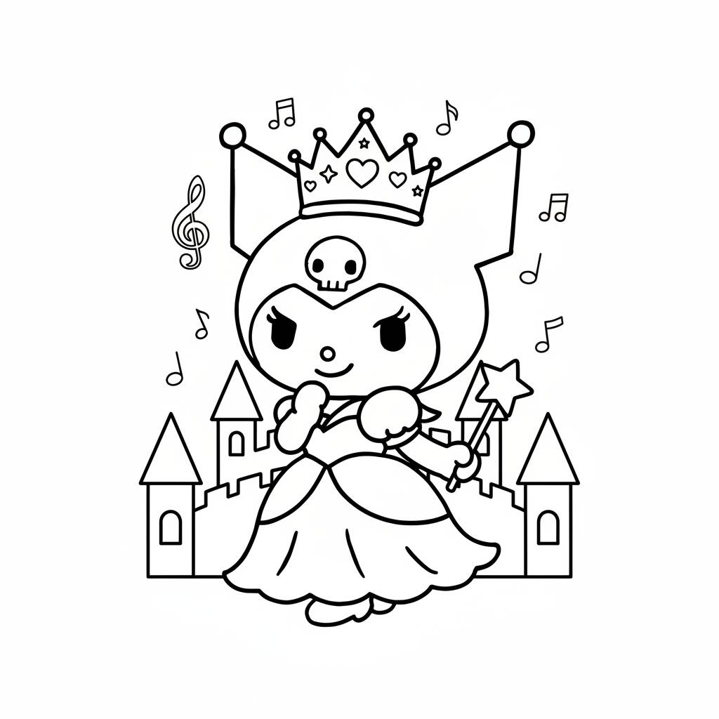 Uma divertida página de colorir da Kuromi vestida de princesa, perfeita para fãs de todas as idades.