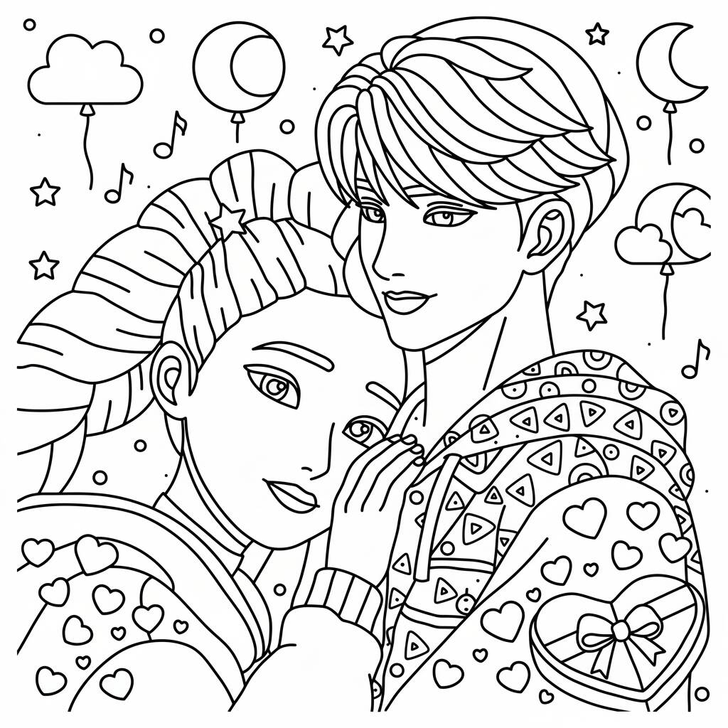 Uma divertida página para colorir com Guerreiras do K-Pop em um momento romântico, perfeita para fãs de K-Pop.