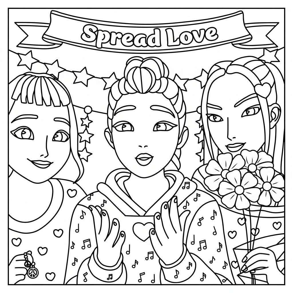 Início » Desenhos Para Colorir » Desenho das Guerreiras do K Pop com mensagem de amor para colorir