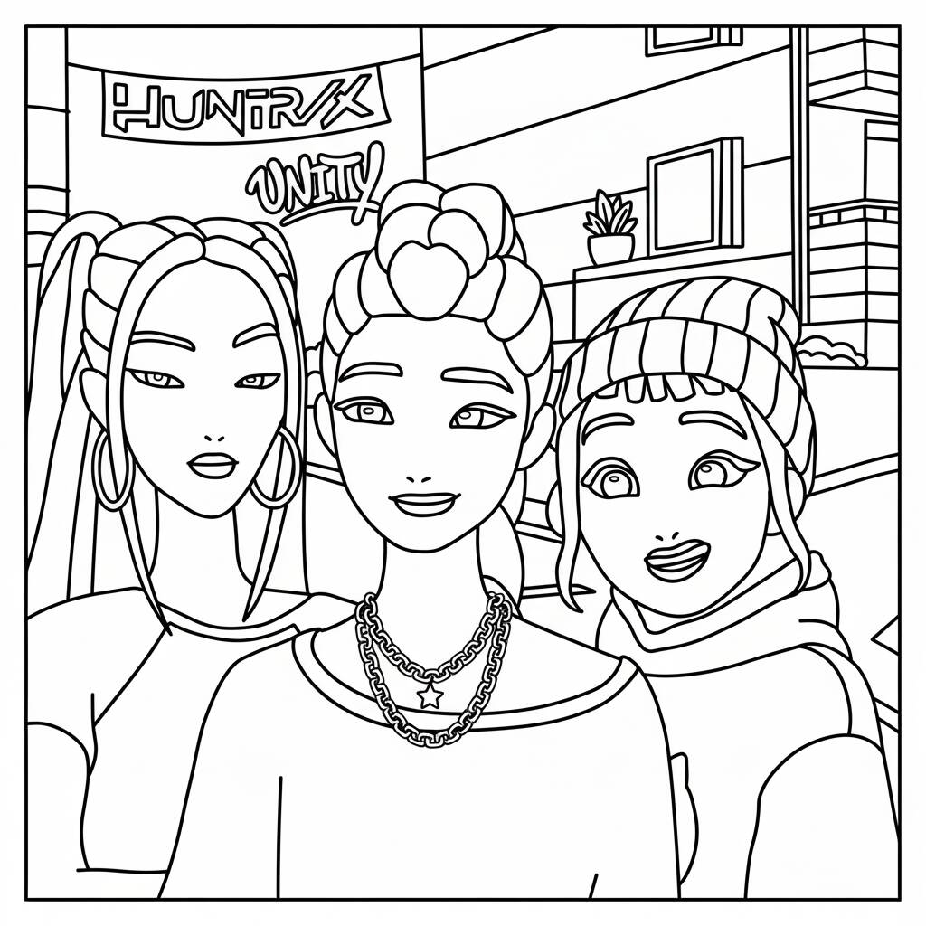 Colorir esta página traz as Guerreiras do K-Pop juntas, prontas para uma nova aventura cheia de estilo e amizade.