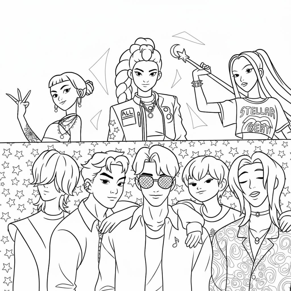 Página de colorir com guerreiras do K-Pop, perfeitas para fãs que amam arte e criatividade.