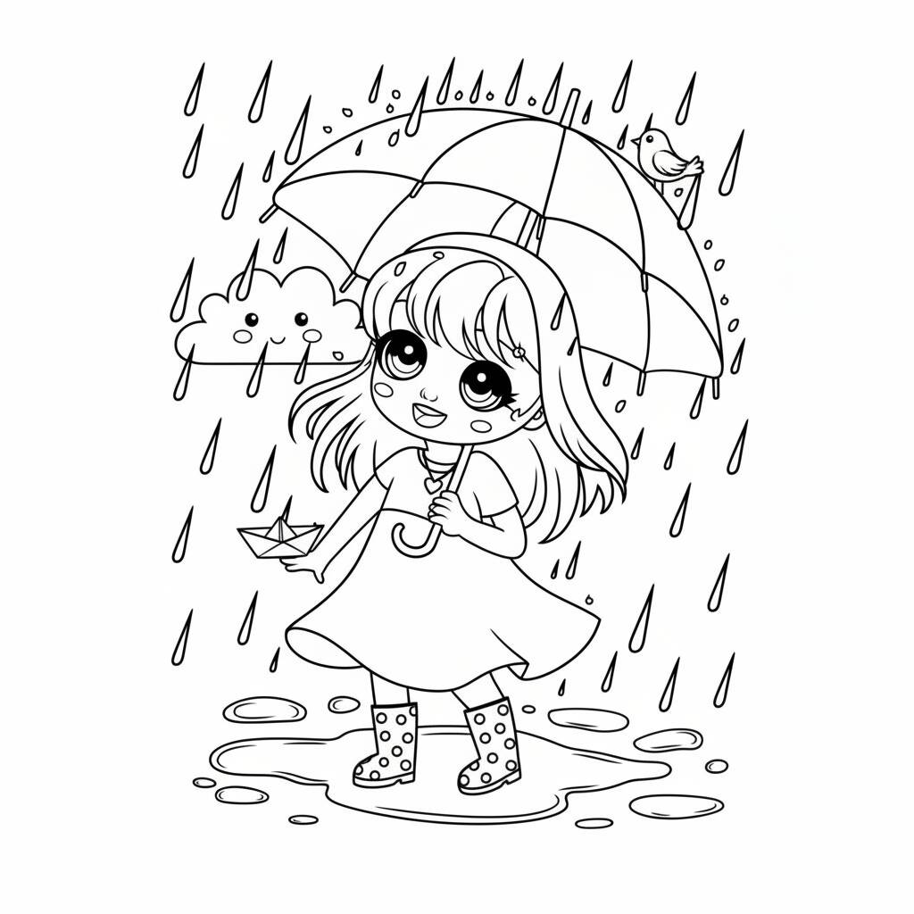 Colorir uma adorável página de anime com uma garota segurando um guarda-chuva em um dia chuvoso.