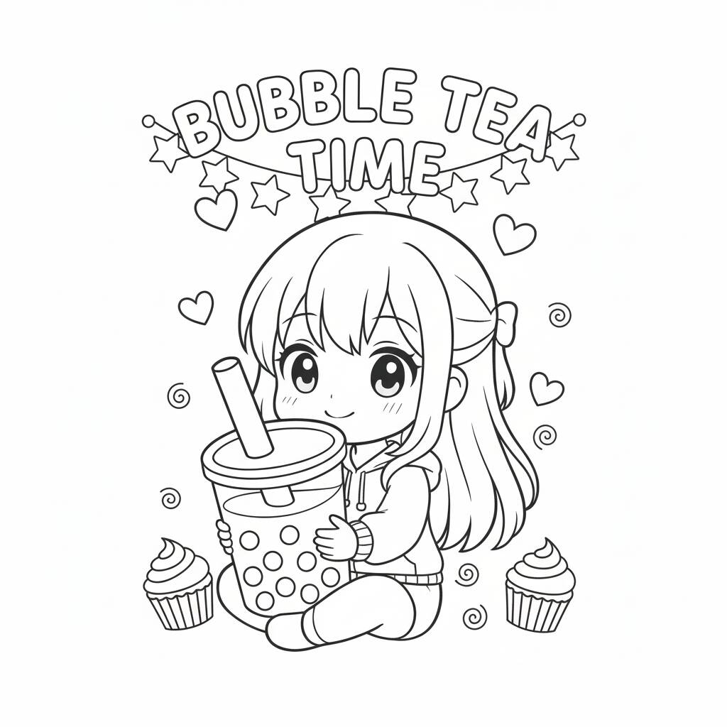 Páginas de colorir de anime com uma adorável garota segurando bubble tea, perfeita para fãs de arte e diversão.