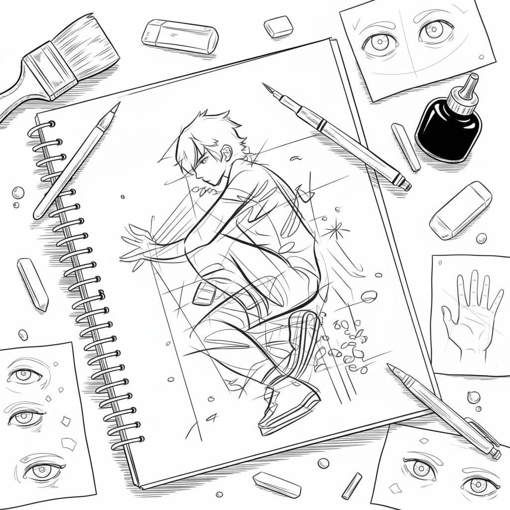 Uma página de colorir temática de anime com um garoto em uma pose criativa, ideal para fãs de arte e entretenimento.