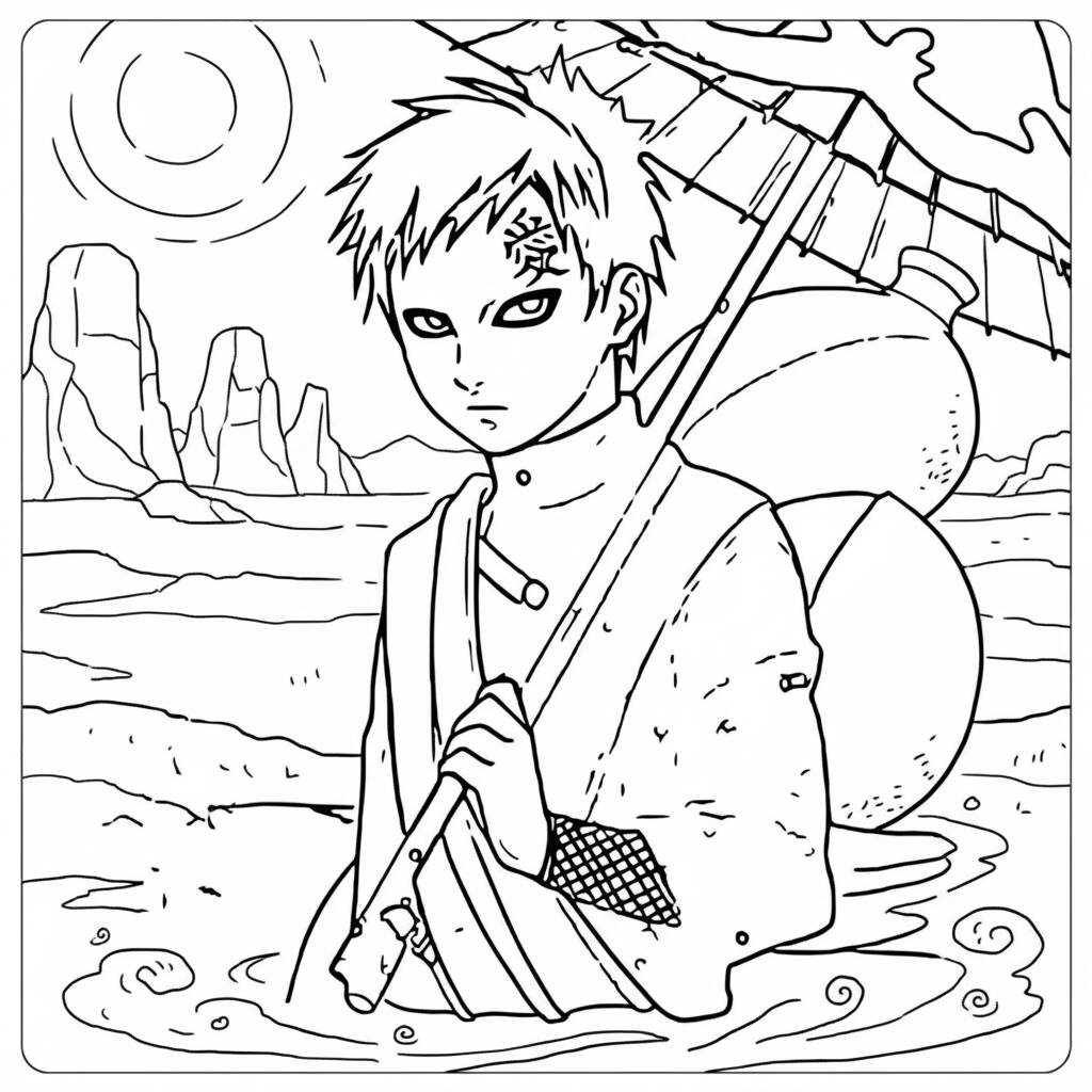 Página de colorir do personagem Gaara do anime, perfeita para fãs de desenhos animados.