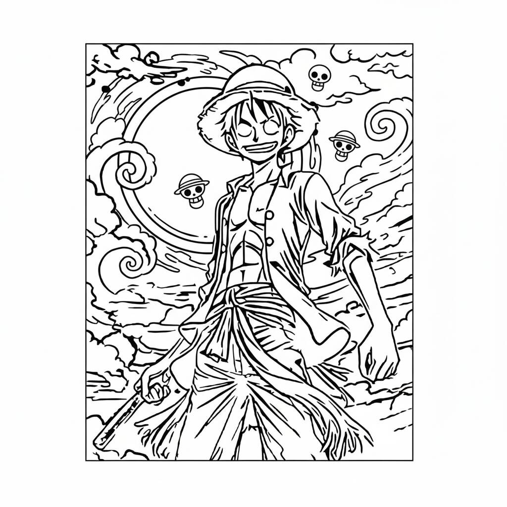 Uma divertida página para colorir do famoso personagem Luffy, do anime One Piece, perfeita para fãs de todas as idades.