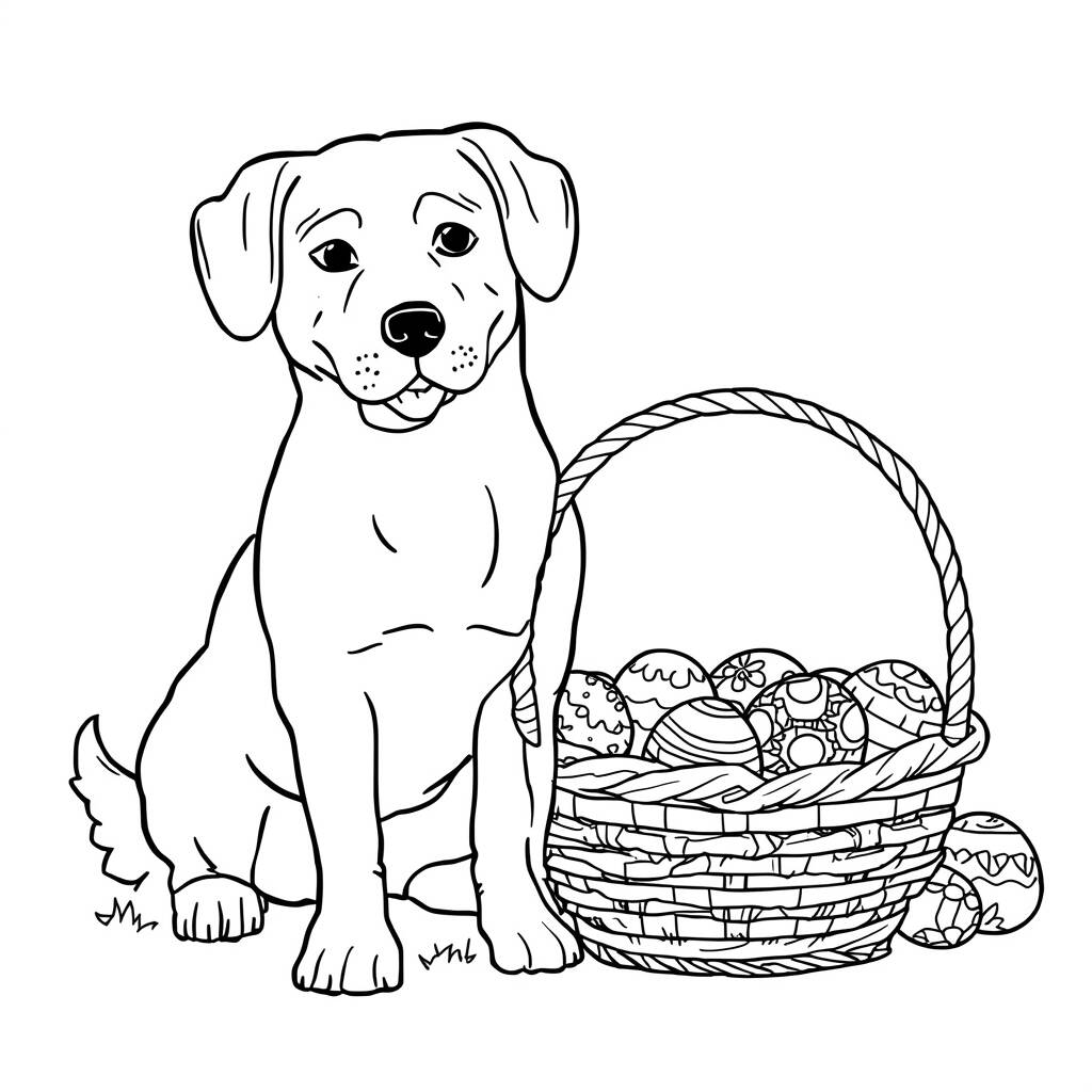 Neste desenho encantador de um cachorro ao lado de uma cesta de Páscoa, visualize um cão amigável com pelagem macia e orelhas grandes, sentado alegremente perto de uma cesta repleta de ovos coloridos. A cena é envolta em um tema de primavera, com flores e folhas frescas ao fundo, criando um ambiente alegre e festivo. As cores vibrantes dos ovos na cesta podem ser exploradas com tons de rosa, azul, amarelo e verde, trazendo vida à imagem.