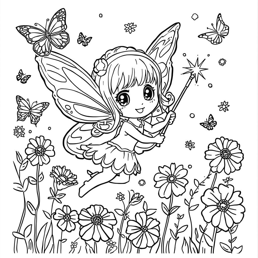 Neste encantador desenho da Fada Kawaii, você pode soltar a sua criatividade enquanto colore a pequena criatura mágica que voa alegremente entre flores coloridas e borboletas delicadas. Com suas grandes asas e uma varinha cintilante, a fada traz um toque de magia ao jardim. Para dar vida a essa cena, escolha cores vibrantes para os detalhes das flores e das asas, usando tons de rosa, azul e amarelo para criar um ambiente alegre e encantador.