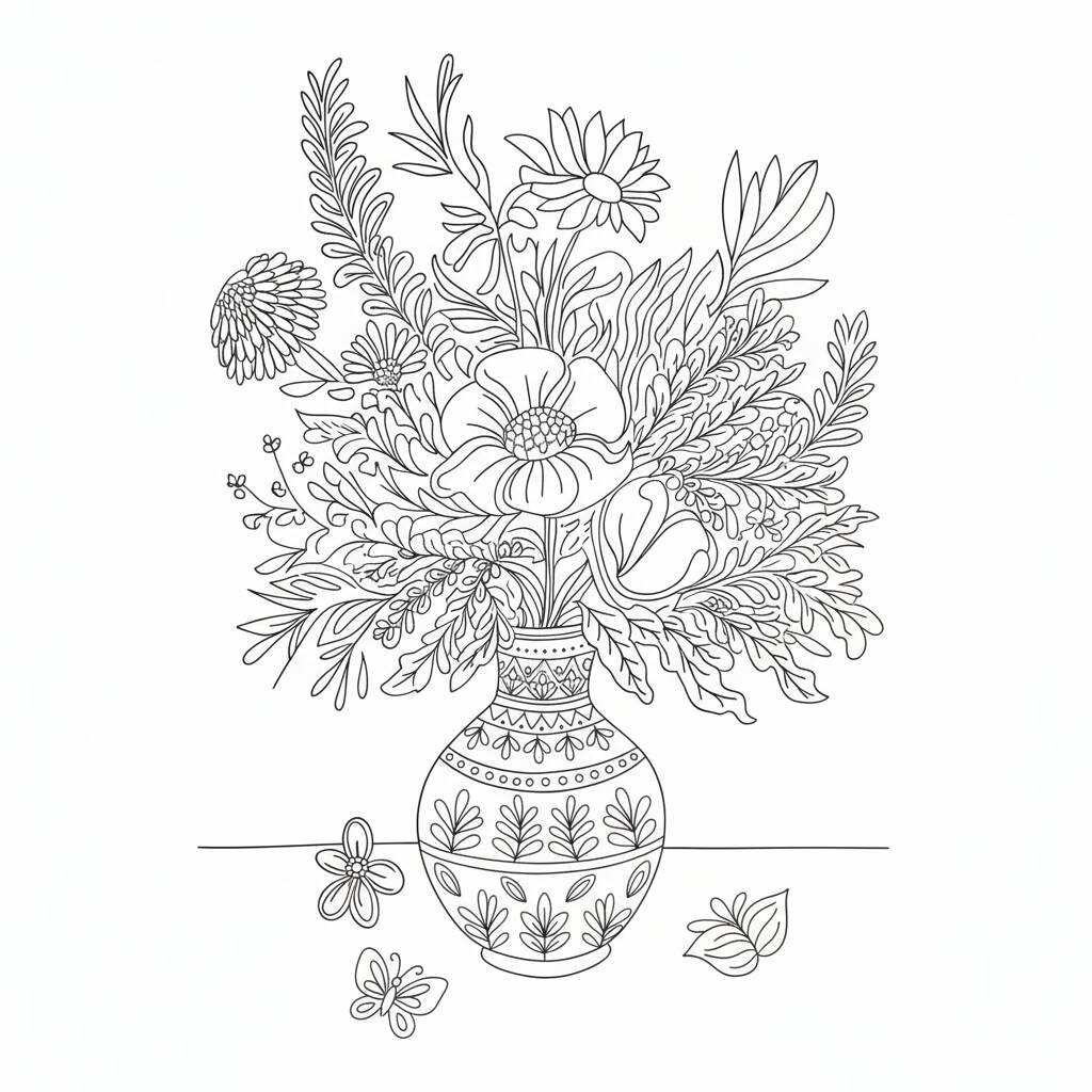 Uma bela página para colorir com flores diversas em um vaso, ideal para estimular a criatividade e relaxar.