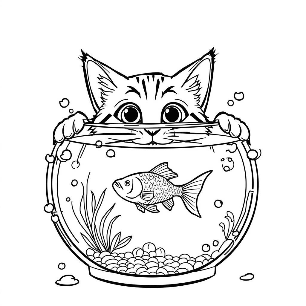 Neste desenho encantador de um gato curioso, vemos um felino observando atentamente um aquário onde um peixinho nada alegremente. O gato, com seus olhos grandes e expressivos, parece fascinado pelas bolhas que sobem à superfície, criando uma atmosfera de curiosidade e diversão. Para colorir, o gato pode ganhar tons quentes de laranja e amarelo, enquanto o peixinho pode ser colorido com vibrantes tons de laranja e azul, refletindo sua personalidade alegre.