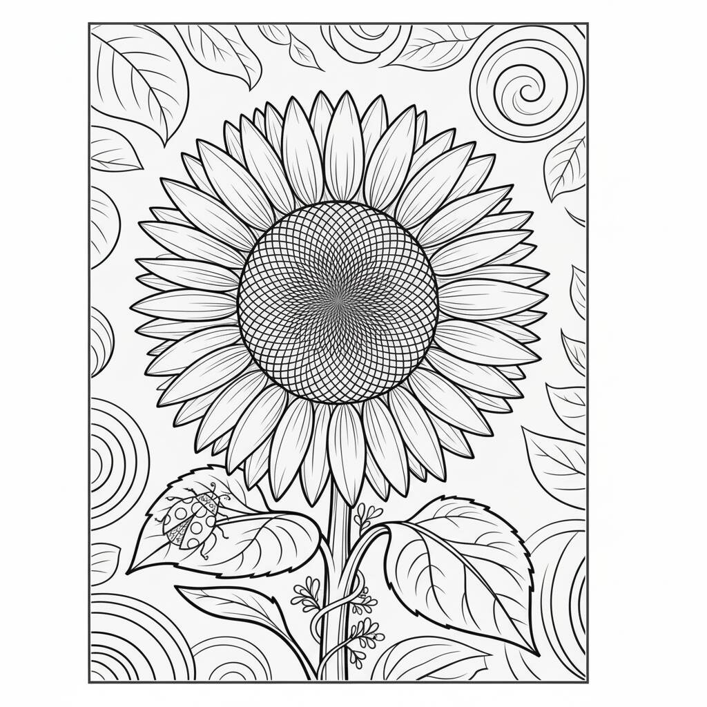 Uma página de colorir com um belo girassol, perfeita para estimular a criatividade e relaxar.