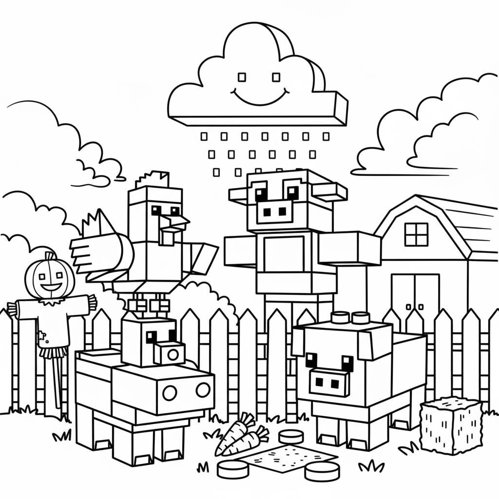 Uma divertida página de colorir com animais do universo Minecraft, perfeita para crianças e fãs do jogo.