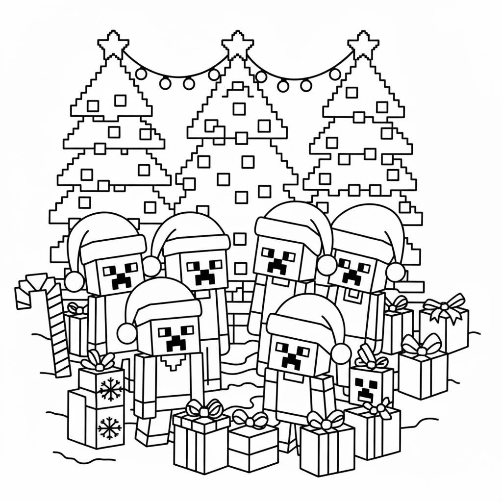 Página de colorir temática de Minecraft com personagens festivos e árvores de Natal.